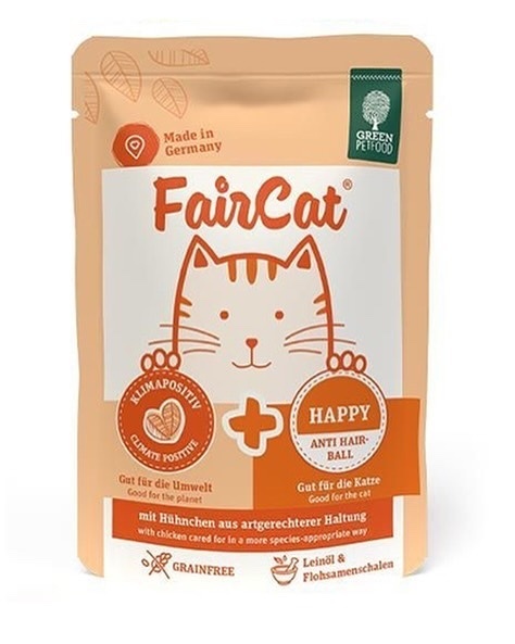 在我們的 FairCat Happy 中,您會發現亞麻籽油和洋車前子殼,它們可以幫助您的成年貓貓處理討厭的毛球。 無穀物食糧對貓貓有益,而且每天都有助於讓世界變得更加可持續:因為這種公平的膳食甚至對氣候有利,並且僅包含以更適合物種的方式飼養的動物的蛋白質。