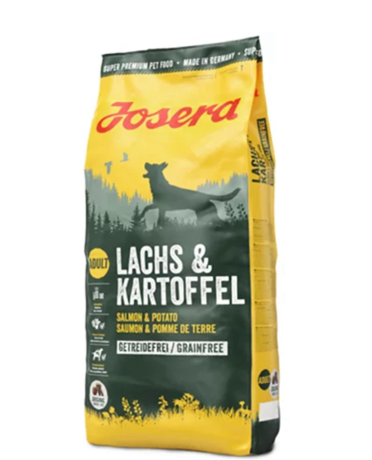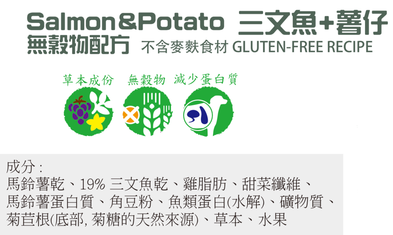 馬鈴薯乾、19% 三文魚乾、雞脂肪、甜菜纖維、馬鈴薯蛋白質、角豆粉、魚類蛋白(水解)、礦物質、菊苣根(底部,菊糖的天然來源) 蛋白質22% 脂肪含量14% 粗纖維2.5% 粗灰質5.6% 鈣0.85% 磷0.65% 鈉0.4% 鉀0.09% 代謝能量15.8MJ/kg 3782kcal/kg