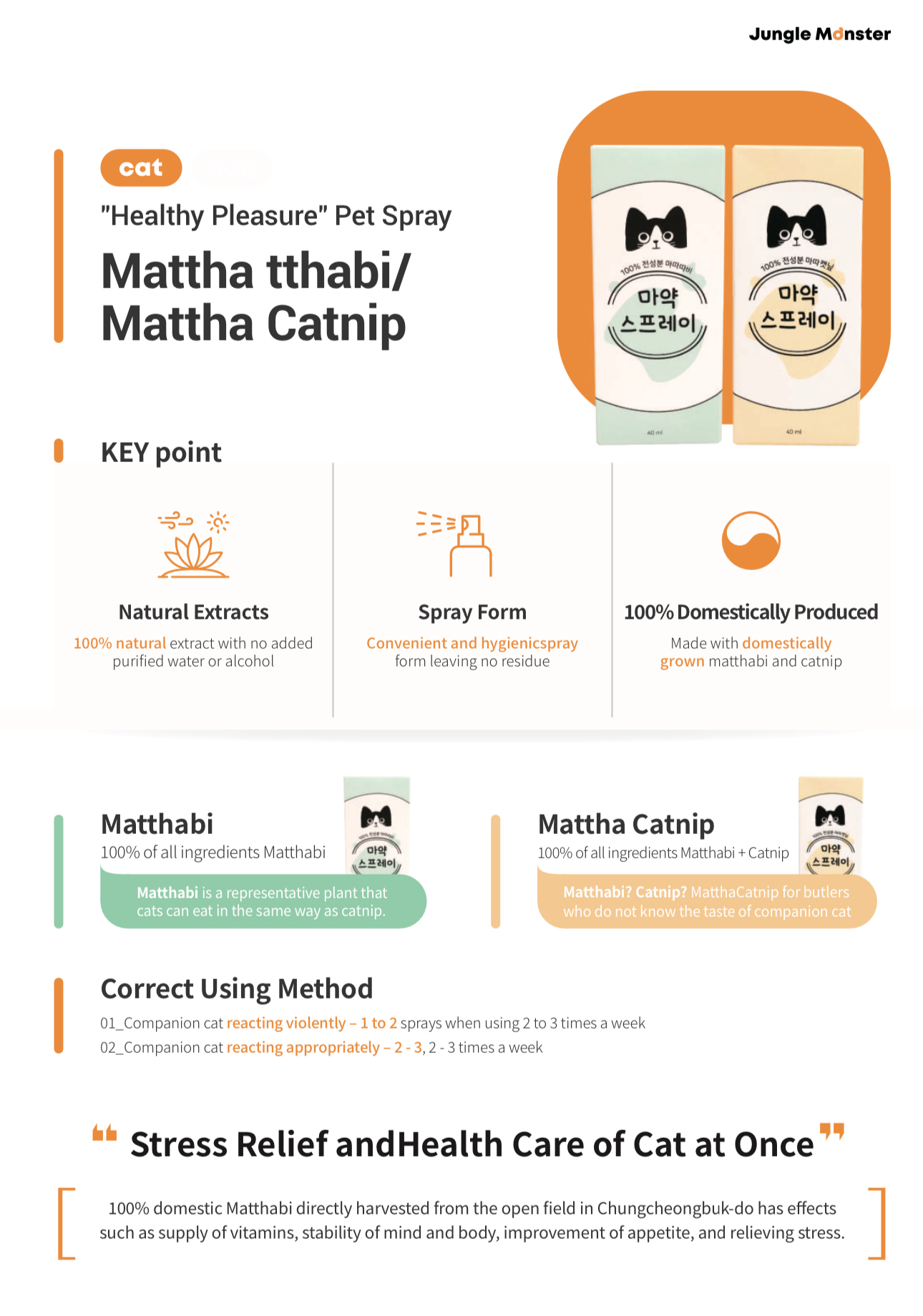 100%純天然萃取,韓國製造,無農藥、無水、無酒精。提供維生素、增食慾、定神安寧、緩解壓力。適合所有貓,特別適用於壓力大、膽怯、拒食或適應新環境時使用。