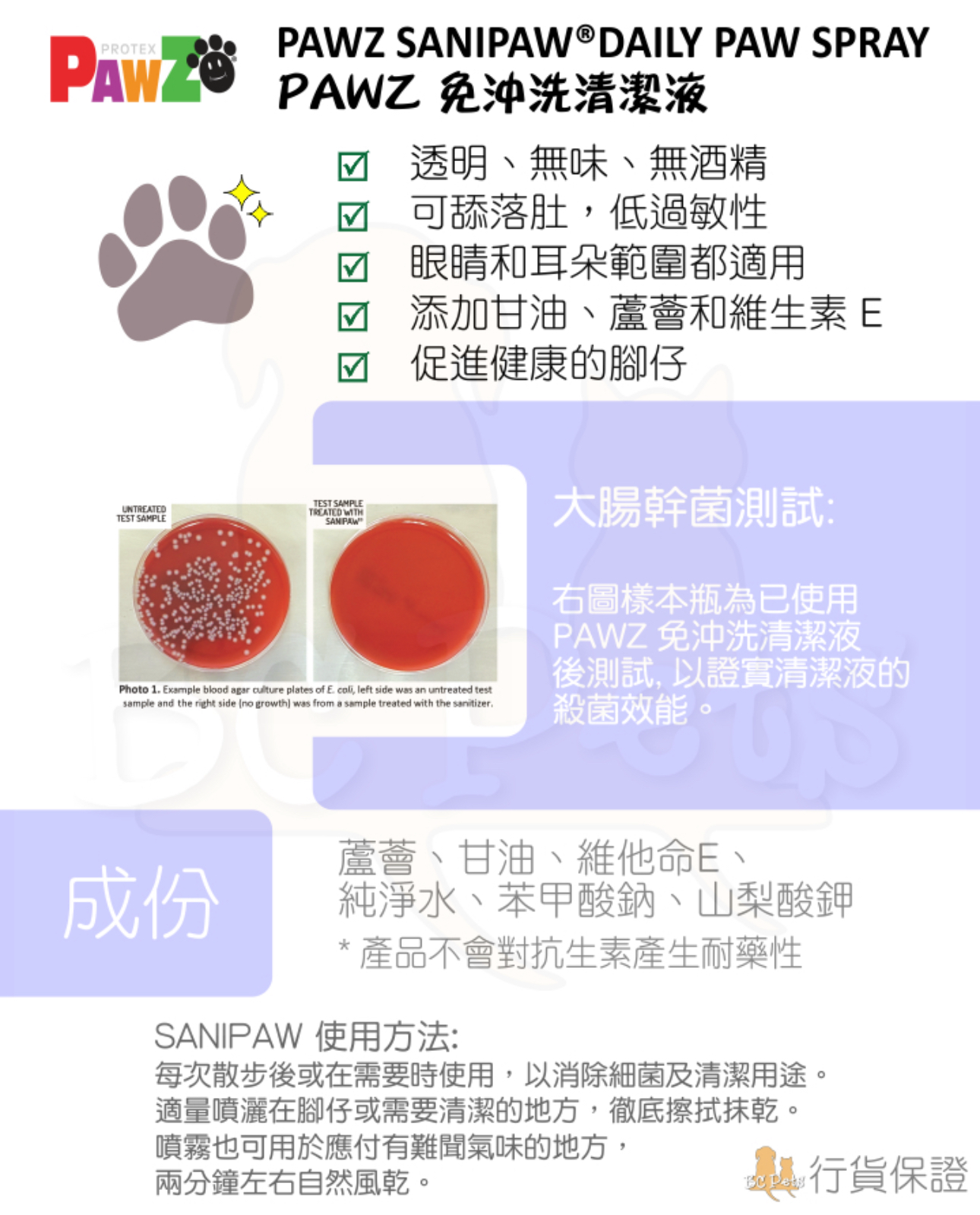產品添加了舒緩的蘆薈和滋養的維生素E,溫和護理寵物敏感的腳掌。它無酒精、無色、無味,能提供清新的清潔效果,不會殘留黏膩感。