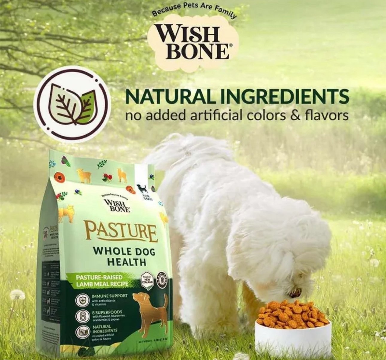 Wishbone Pasture 注入了 8 種營養豐富的香草、水果和蔬菜的功效,包括羅勒、蔓越莓、亞麻籽和木瓜。這些,再加上牛磺酸以及必需的維生素和礦物質,可以從內部增強您的狗的免疫力。每袋 Wishbone 均由動物營養師精心製作,以保持 75% 動物成分和 25% 功能性成分的健康平衡。